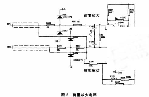 信號前置放大級的增益不易設(shè)定太高,以免在干擾較強時引起信號嚴重失真,為更好地消除共模電壓,設(shè)計了自舉屏蔽馭動電路,如圖2所示.采用緩沖放大器將連接點的共模電位馭動到屏蔽線.在輸入共模信號時使屏蔽線與芯線等電位.在差模信號輸人時沒有影響.