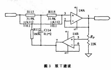 傳感器輸出信號受到各種嗓聲的干擾,嗓聲來源通常有下面幾種:工頻干擾、電極接觸噪聲、基線漂移等.其中,這些干擾中50Hz的工頻干擾最為嚴重,也是最難消除的.其他的各種嗓聲通過高截低通、高通低截濾波方法可以很好地消除.本文主要討論50H的工頻干擾的濾除.本系統(tǒng)充分發(fā)揮單片機系統(tǒng)的強大優(yōu)勢,編制50Hz數(shù)字濾波程序,從硬件和軟件2方面對其進行消除.硬件部分采用雙T有源濾波器.其具體電路如圖3所示.
