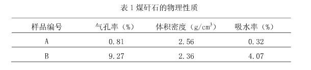 觀察兩種煤矸石外貌特征:A礦的煤矸石屬于巷道矸石;B礦的煤矸石屬于過火矸石。其 物理性質(zhì)見表1.由表1知,A礦煤矸石氣孔率低、體積密度小大、吸水率小。可見,A礦煤矸石的致密度相對較高。