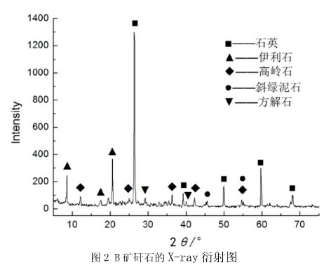 未了解兩種煤矸石的礦物組成,對它們分別進(jìn)行物相分析,其X-ray衍射圖如圖 l 、圖 2 所示。從中可以看出, A 礦矸石的主要礦物相為石英、高齡石和伊利石和斜綠泥石;B礦矸石的主要礦物相為石英、高嶺石、伊利石、斜綠泥石和方解石。兩礦矸石中各礦物相含量見表 4 。