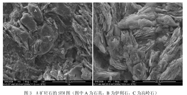 圖3 是 A 礦煤矸石典型的顯微結(jié)構(gòu)照片。可以看出,該礦主要由 A 、 B 、 C 三種晶相構(gòu)成,結(jié)合EDS能譜分析知道, A 為石英、 B 為高嶺石、 C 為伊利石。石英晶體結(jié)構(gòu)致密、沒有很明顯的棱角結(jié)構(gòu),高嶺石土要呈層狀薄片結(jié)構(gòu)、紋理比較清晰,伊利石多以解離塊狀形式存在。這與前面礦物相分析結(jié)果是一致的。