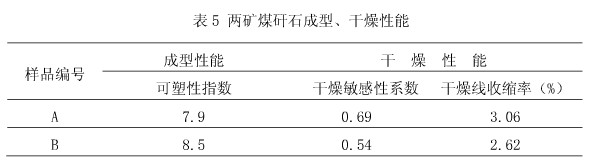 由表4可知:B礦的成型性能略好于A礦,A礦和B礦的干燥敏感性系數(shù)小于l,適宜于快速干燥,則A礦和B礦都適宜制磚。
