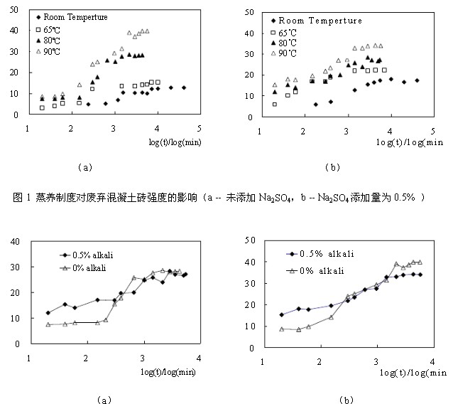 目前對混凝土廢棄物的利用研究大多數集中在回收粗細骨料方面及制備膠凝材料。但是和天然骨料相比,回收骨料存在低表觀密度和高的吸水率等不足,還不能完全替代天然骨料。制備的混凝土材料強度較低,特別是斷裂強度存在不足,只能應用在低等級混凝土制備。因此盡管開展了對這些廢棄混凝土再利用的研究,但處理很不完善,大部分還是采取露天存放或就地掩埋的簡單方式處理,這樣無疑會占用大量耕地,同時也會造成環境污染。因此需要找到一條降低廢棄物處理成本、又能充分利用這些廢棄物有效途徑。最近我們利用廢棄混凝土成功制備了可作為墻體承重材料應用的半干壓成型磚,廢棄混凝土的利用率為99%。本文利用廢棄混凝土制備半干壓成型磚,研究了蒸養制度對成型磚性能的影響規律。