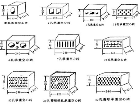 目前,我國(guó)生產(chǎn)的承重空心磚的規(guī)格較多.孔型也較多(如有圓形、橢圓形、長(zhǎng)方形、方型、菱型、三角型)。承重空心磚絕大多數(shù)為垂直孔。見(jiàn)表1-1-2和圖1-1-1。