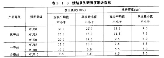 根據(jù)產(chǎn)品的強(qiáng)度等級(jí)、尺寸偏差、外觀質(zhì)量及耐久性等又分為優(yōu)等品(A)、一等品(B)和合格品(C)三個(gè)產(chǎn)品等級(jí)。各產(chǎn)品等級(jí)對(duì)應(yīng)的強(qiáng)度等級(jí)及指標(biāo)要求見(jiàn)表1一1一3所示。