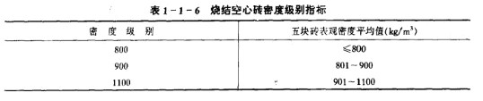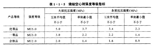 ② 強(qiáng)度等級(jí)與產(chǎn)品等級(jí):燒結(jié)空心磚根據(jù)其大面和條面的抗壓強(qiáng)度分為MU5.0、 MU3.0、MU2.0三個(gè)強(qiáng)度等級(jí),同時(shí)又按其表觀密度分為800、900、1100三個(gè)密度級(jí)別。每個(gè)密度級(jí)別根據(jù)其孔洞及孔排列數(shù)、尺寸偏差、外觀質(zhì)量,強(qiáng)度等級(jí)和耐久性等分為優(yōu)等品(A)、一等品(B)和合格品(C)三個(gè)產(chǎn)品等級(jí)。各產(chǎn)品的等級(jí)對(duì)應(yīng)的強(qiáng)度等級(jí)及指標(biāo)要求見(jiàn)表1一l一5。各密度級(jí)別指標(biāo)見(jiàn)表1