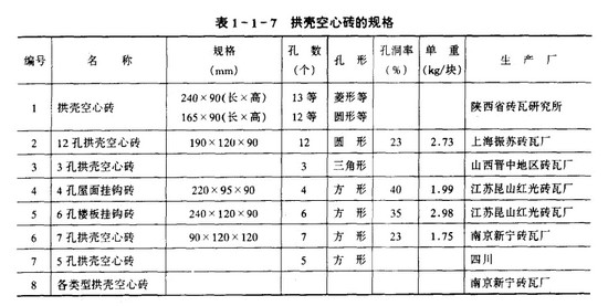 拱殼空心磚是我國(guó)在70 年代研制成功的,它的一端有鉤,另一端帶凹槽.施工時(shí)利用磚與磚之間的掛鉤懸砌.砌筑磚拱殼不用模板支撐,而只要一個(gè)簡(jiǎn)單的樣架控制曲線。.拱殼空心磚是一種適宜砌筑拱和薄殼的新型建筑材料。參見(jiàn)表l一l一7和圖l一1一4。拱殼磚是一種結(jié)構(gòu)材料。建筑物的防水、隔熱需采用另外的措施來(lái)解決。在地震區(qū)和有強(qiáng)烈振動(dòng)的建筑物.在未采取有效措施前也不宜采用。