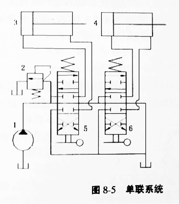 如圖8-5所示,單聯系統中換向閥采用三位六通閥,各個換向閥之間采用串并聯,即各個執行元件的回油路聯結在一起,前一個執行元件的換向閥的中位回油進入下一個執行元件。單聯系統的特點是各個執行元件只能單獨動作,同時操作幾個換向閥時,由于后面執行元件的進油被切斷,不能動作,只有最前面(距油泵最近)的執行元件進油而動作。所以說這種油路具有“聯鎖”的作用,故又稱為優先聯結、順序單動油路。